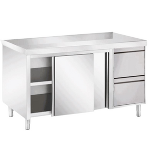 Edelstahl Arbeitsschrank mit 2 Schubladen rechts, mit Zwischenboden - alle Größen montiert