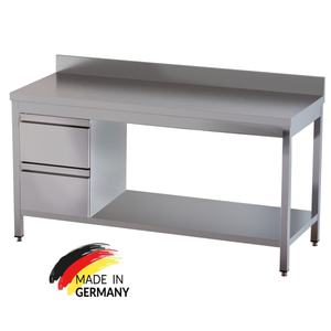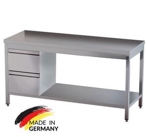 Edelstahl Arbeitstisch mit Grundboden, 2 Schubladen links, Premium - alle Größen montiert