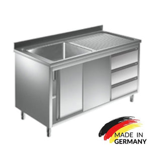Edelstahl Spülschrank 1 Becken links, mit Aufkantung, 3 Schubladen rechts, Premium - alle Größen montiert