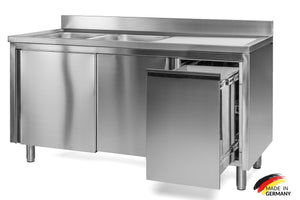Edelstahl Spülschrank 2 Becken links, mit Aufkantung, Abfallbehälter rechts, Premium - alle Größen montiert