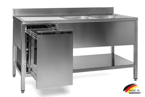 Edelstahl Spültisch 2 Becken rechts, mit Grundboden, mit Aufkantung, Abfallbehälter links, Premium - alle Größen montiert